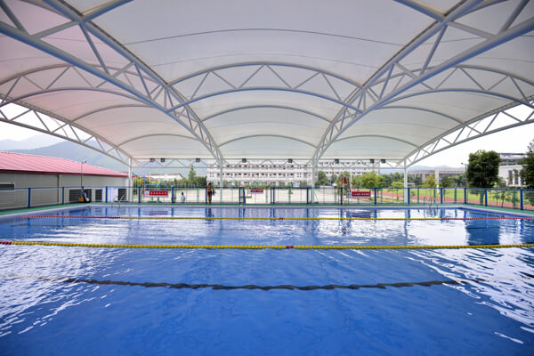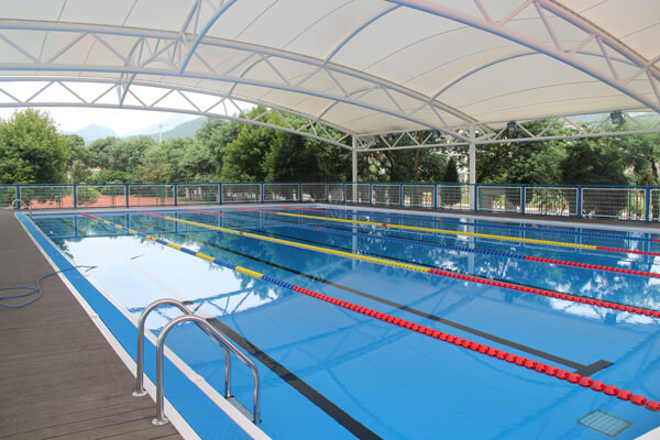 泳池为拆装式游泳池,设有钢膜雨蓬、安全围栏、照明等设施,适合各种游泳比赛、训练和游泳运动健身。游泳池长25m,宽15m,水深1.2m。内设8条泳道,分设浅水区和深水区,能满足不同水平游泳爱好者的游泳需求。池内采用国际先进水平的溢水循环系统,水质经氯气、臭氧等消毒,水质符合国际专业比赛用水标准,馆内可容纳观众300人左右,于2017年5月正式投入使用。